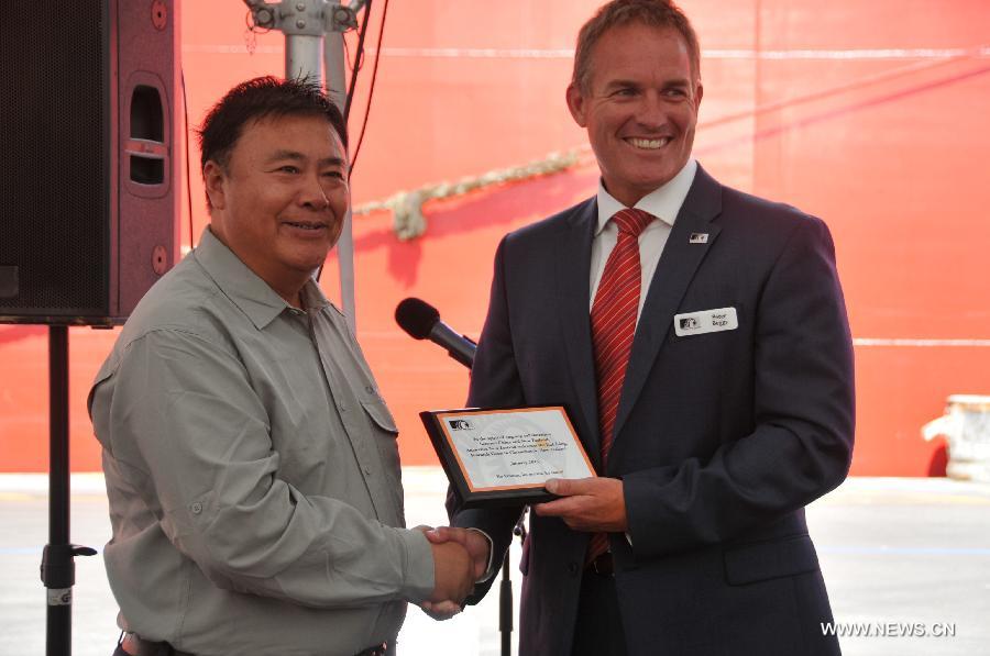 | Chief Executive of Antarctica New Zealand Peter Beggs (R) presents gifts to the Chinese icebreaker Xue Long in Christchurch, New Zealand, Jan. 17, 2015. Chinese icebreaker and polar research vessel Xue Long arrived at Lyttelton Port in Christchurch on Friday. The Christchurch City Council and Antarctica New Zealand welcomed the vessel in Maori style. (Xinhua/Su Liang) |