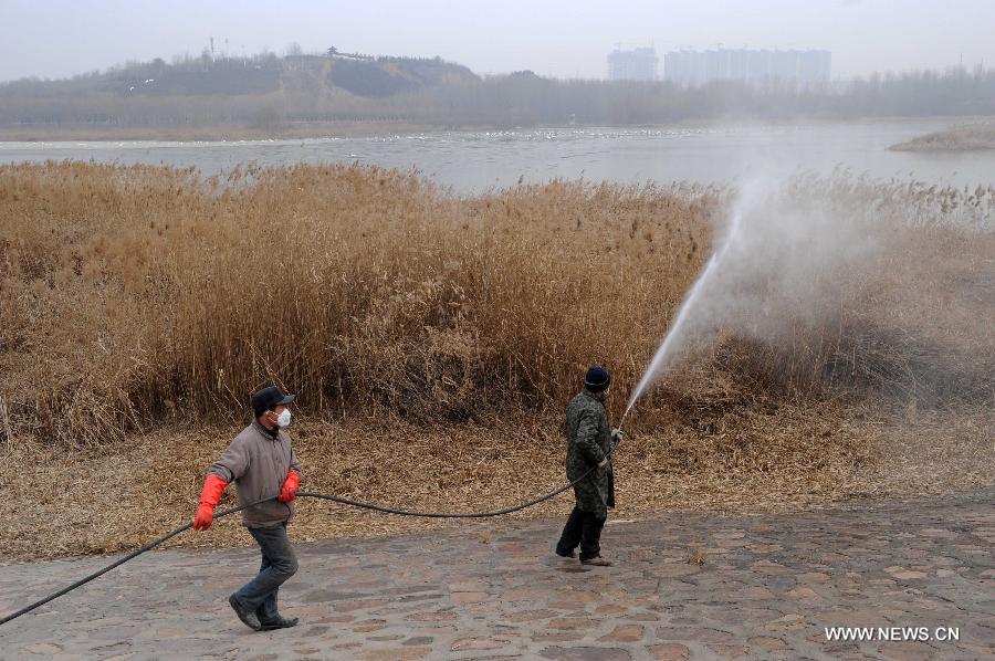 Staff members disinfect the surrounding areas at the Sanmenxia Reservoir Area of the Yellow River, central China's Henan Province, Jan. 17, 2015. A total of 93 wild birds including swans and wild ducks had died in the area as of Jan. 14. According to the National Bird Flu Reference Laboratory, the H5N1 virus, a highly contagious strain of bird flu, has caused deaths in the Sanmenxia Reservoir Area, which is a winter habitat for swans that migrate from Siberia in Russia. Local government in Sanmenxia have taken a variety of measures to prevent a possible spread of the virus, including blocking the entrance and examining people who had close contact with the birds. No human infection has been reported so far. (Xinhua/Zhu Xiang)