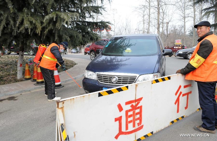 Staff members disinfect a vehicle at the entrance to the Sanmenxia Reservoir Area of the Yellow River, central China's Henan Province, Jan. 17, 2015. A total of 93 wild birds including swans and wild ducks had died in the area as of Jan. 14. According to the National Bird Flu Reference Laboratory, the H5N1 virus, a highly contagious strain of bird flu, has caused deaths in the Sanmenxia Reservoir Area, which is a winter habitat for swans that migrate from Siberia in Russia. Local government in Sanmenxia have taken a variety of measures to prevent a possible spread of the virus, including blocking the entrance and examining people who had close contact with the birds. No human infection has been reported so far. (Xinhua/Zhu Xiang)