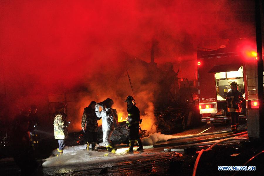 Firemen works at a liquefied gas station which exploded after a tank truck caught fire in the Jinzhou District in Dalian, northeast China's Liaoning Province, Jan. 17, 2015. The explosion caused 4 injures who were sent to hospital for treatments. (Xinhua/Liu Debin)