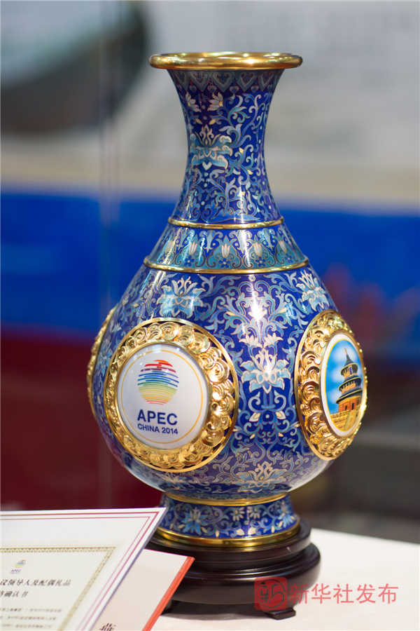 Photo taken on Jan. 18 2015 shows a duplicated cloisonné vase, one of the three-piece gift set of APEC 2014. (Xinhua/Su Yang)