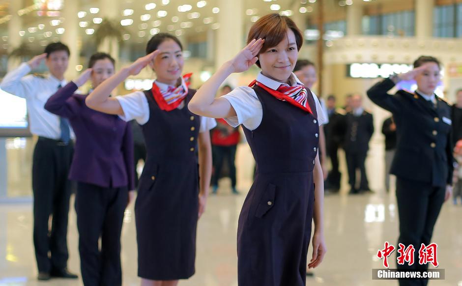 A flash mob, consisting of staff members in uniforms, welcomes passengers at Nanjing South Railway station , east China's Jiangsu province on Jan. 15, 2015. (CNS/Yang Bo)