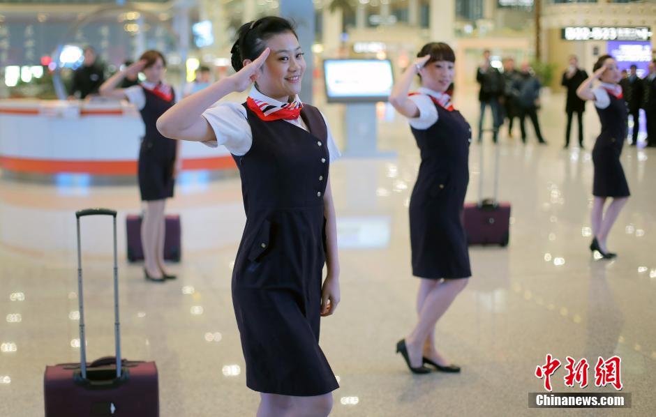 A flash mob, consisting of staff members in uniforms, welcomes passengers at Nanjing South Railway station , east China's Jiangsu province on Jan. 15, 2015. (CNS/Yang Bo)