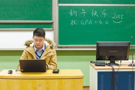 1:27 a.m., Jan. 1, 2015 - Wang Zhongyi, a college student, prepares for the final examination of the year. "Happy new year" written on the blackbord was the message left by the leaving student. (Photo/China Youth Daily)