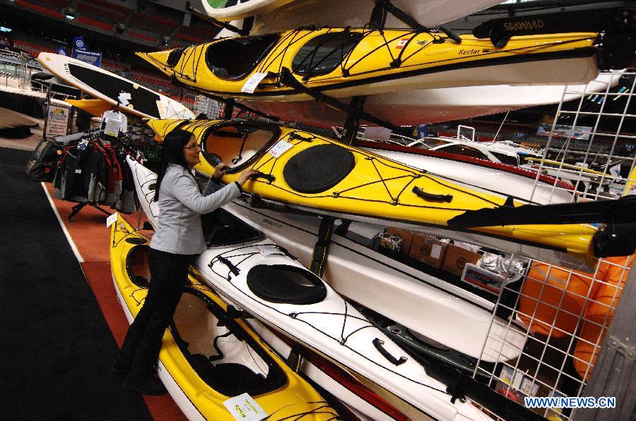 A visitor looks at kayaks at the 2015 Vancouver International Boat Show at BC Place in Vancouver, Canada, Jan. 21, 2015. Canada's premier 5-day Vancouver International Boat Show featured the largest display of season's hottest boats, engines, electronics, marine gifts and accessories. (Xinhua/Sergei Bachlakov)