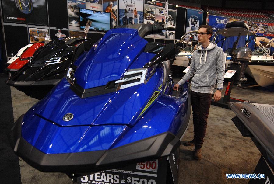 A visitor looks at a Ski-Doo on dsplay at the 2015 Vancouver International Boat Show at BC Place in Vancouver, Canada, Jan. 21, 2015. Canada's premier 5-day Vancouver International Boat Show featured the largest display of season's hottest boats, engines, electronics, marine gifts and accessories. (Xinhua/Sergei Bachlakov)