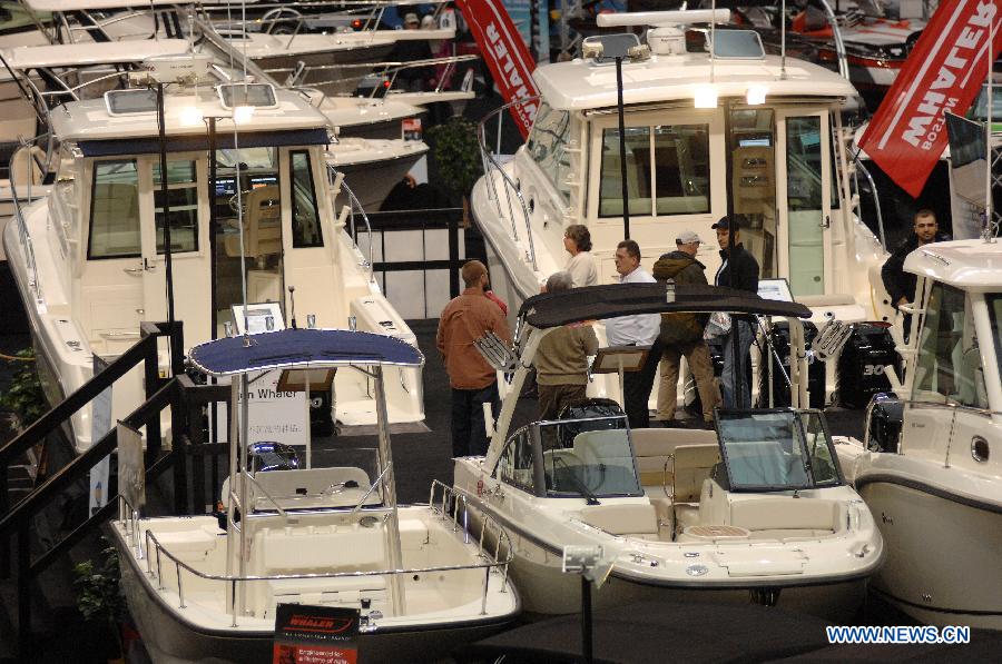 | Visitors look at boats on display at the 2015 Vancouver International Boat Show at BC Place in Vancouver, Canada, Jan. 21, 2015. Canada's premier 5-day Vancouver International Boat Show featured the largest display of season's hottest boats, engines, electronics, marine gifts and accessories. (Xinhua/Sergei Bachlakov) |