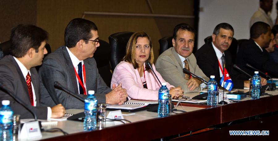 Josefina Vidal Ferreira (3rd L), director general for the United States of the Cuban Ministry of Foreign Affairs, reacts at the Conventions Palace of Havana in Havana, Cuba, Jan. 21, 2015. Cuba and the United States began historic high-level Jan. 21-22 talks on restoring relations and immigration issues on Wednesday. (Xinhua/Liu Bin)