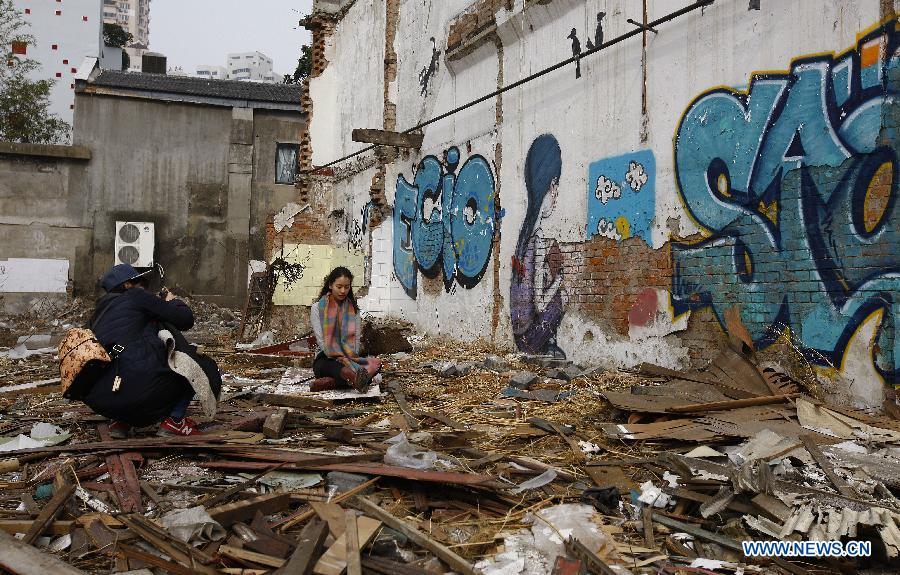 | A woman poses for photo in front of graffiti paingtings on a demolished wall in Shanghai, east China, Jan. 22, 2015. Graffiti paintings were found recently on debris at a residential lane, where old houses were demolished. (Xinhua/Fang Zhe) |