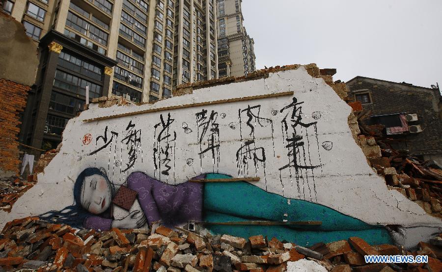 Graffiti paintings are seen on a demolished wall in Shanghai, east China, Jan. 22, 2015. Graffiti paintings were found recently on debris at a residential lane, where old houses were demolished. (Xinhua/Fang Zhe)