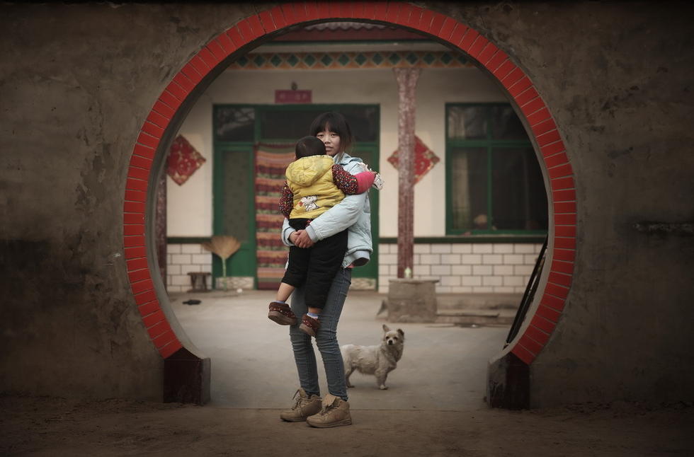 Zhang Jing holds her 2-year-old son in her parents' courtyard in Dingzhou, Hebei, Jan. 4, 2015. (Beijing News/Ying Yafei)