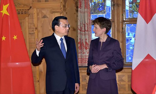 | Chinese Premier Li Keqiang talks with President Simonetta Sommaruga of the Swiss Confederation on the sidelines of the 2015 annual meeting of the World Economic Forum in Davos on Wednesday. Photo: Xinhua |