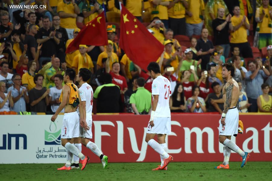 China's players leave the court after the quarterfinal match against Australia at the 2015 AFC Asian Cup in Brisbane, Australia, Jan. 22, 2015. China lost the match 0-2. (Xinhua/Guo Yong)