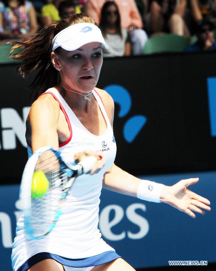 Agnieszka Radwanska of Poland returns the ball against Varvara Lepchenko of the United States during the third round of the women's singles on Day 6 of the 2015 Australian Open tennis tournament in Melbourne on Jan. 24, 2015. Agnieszka Radwanska won 6-0 7-5. (Xinhua/Jin Linpeng)