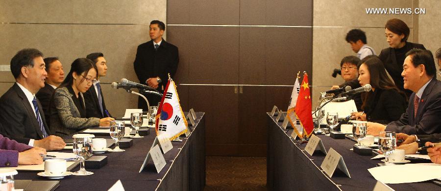Chinese Vice Premier Wang Yang(1st L) holds talks with South Korean Deputy Prime Minister Choi Kyoung-hwan(1st R) in Seoul, South Korea, Jan. 23, 2015. (Xinhua/Yao Qilin)