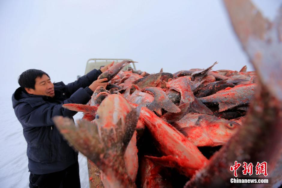 Dealers load fresh fishes captured from the Bosten Lake in northwest China’s Xinjiang Uygur autonomous region on Jan. 22, 2015. (Photo/CNS)