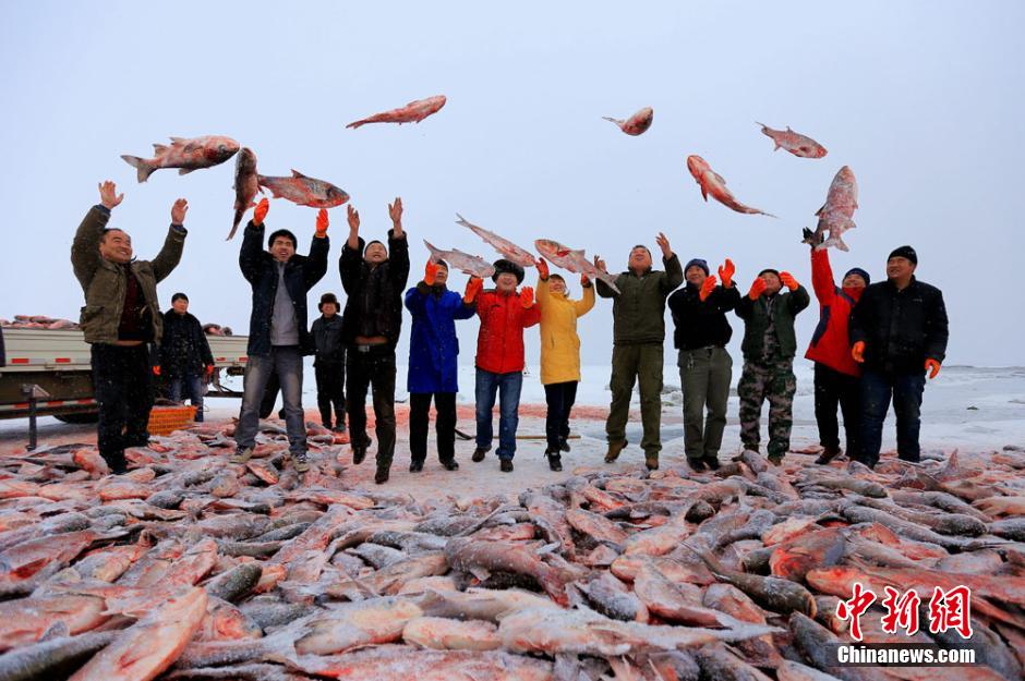 A total of 17 tons of fishes are captured in one net after 14 fishermen worked together for 12 hours, setting a record since 2011. Fishes of the freshwater lake, located on the northeastern rim of the Tarim Basin, sell well, according to dealers. (Photo/CNS)