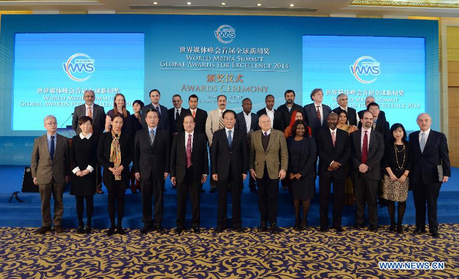 | Winners and presenters pose for photos during the awarding ceremony of the World Media Summit (WMS) Global Awards for Excellence 2014 in Beijing, capital of China, Jan. 27, 2015. (Xinhua/Chen Yehua) |