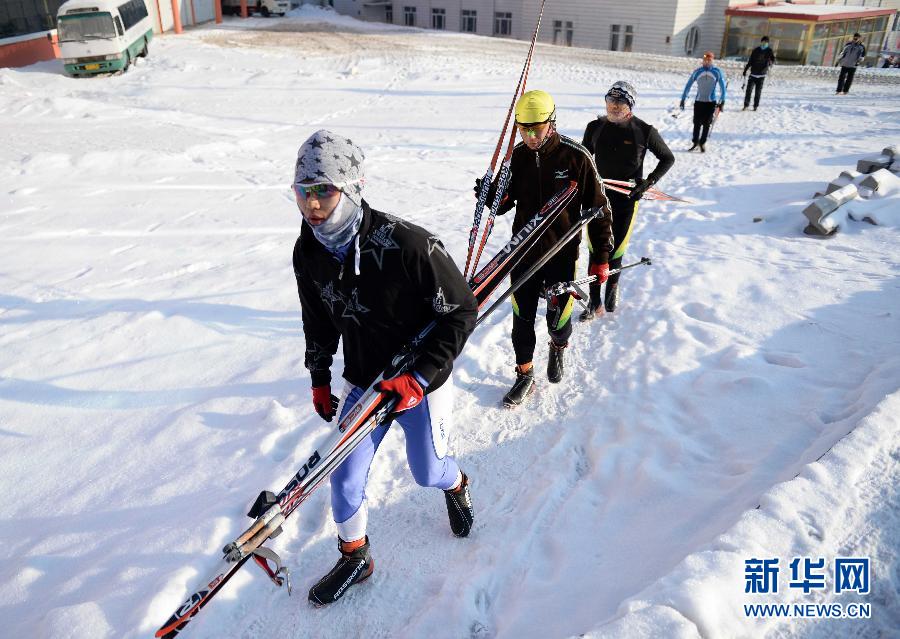 Team members train in the snow on Jan. 22, 2015. (Xinhuanet/Wang Kai)