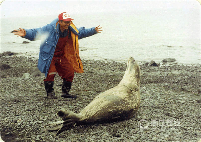 An expedition team member plays with a seal on King George Island. (Photo/ zjol.com.cn)