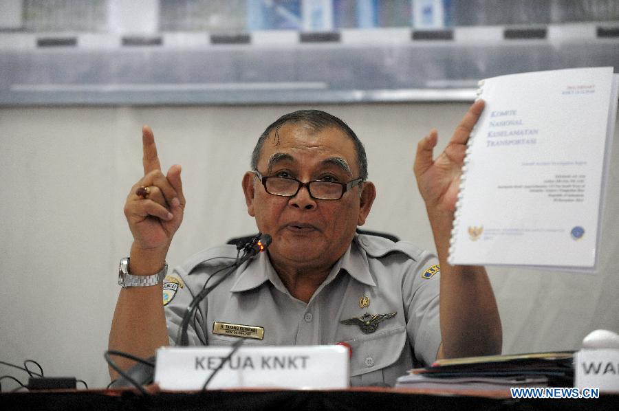 Tatang Kurniadi, head of National Transport Safety Committee (KNKT), speaks during the press conference of preliminary accident report of AirAsia QZ8501 in Jakarta, Indonesia, Jan. 29, 2015. The French co-pilot was flying the AirAsia flight before it crashed into Indonesia's waters last month, investigators said here on Thursday. (Xinhua/Agung Kuncahya B.)