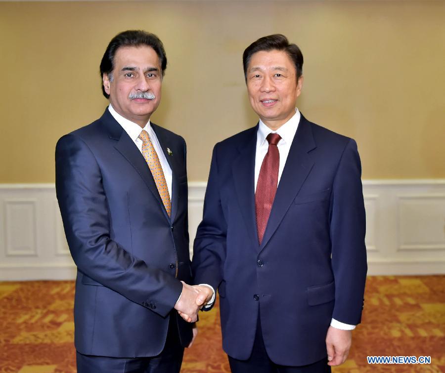 | Chinese Vice President Li Yuanchao (R) meets with Sardar Ayaz Sadiq, speaker of Parliament of Pakistan, before the launching ceremony of the China-Pakistan Year of Friendly Exchanges for 2015 in Beijing, capital of China, Jan. 28, 2015. (Xinhua/Li Tao) |