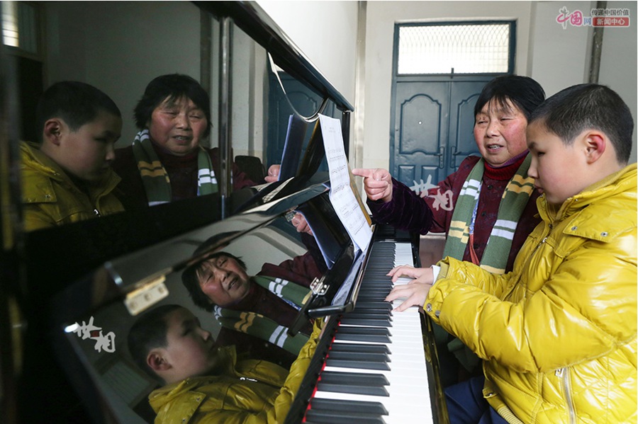Li Xin plays the piano while his grandmother reads the music score for him. (China.org/Pu Cun)