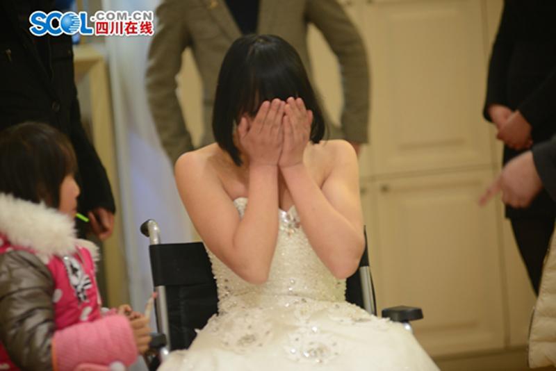 Xu Yan feels shy when she wears a strapless wedding dress. (Photo/scol.com.cn)