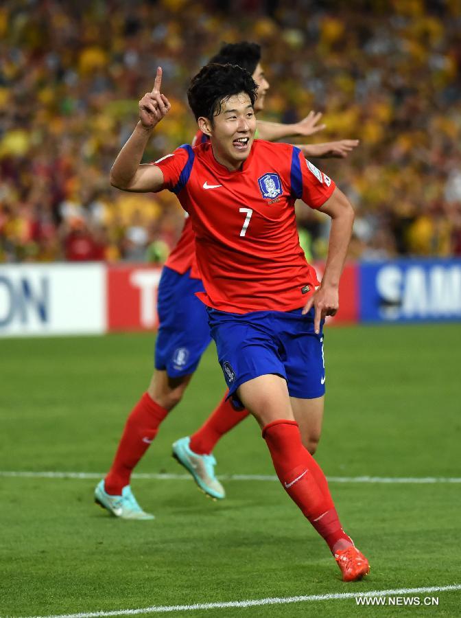 South Korea's Son Heung Min (front) celebrates after scoring during the final match against Australia at the 2015 AFC Asian Cup in Sydney, Australia, Jan. 31, 2015. (Xinhua/Guo Yong)