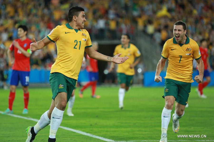 Australia's Massimo Luongo (L) celebrates after scoring a goal during the final match against South Korea at the 2015 AFC Asian Cup in Sydney, Australia, Jan. 31, 2015. (Xinhua/Qiu Zhongquan)