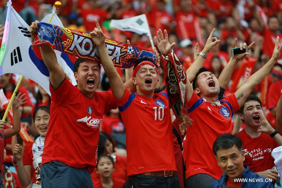 Fans of South Korea cheer for the team during the final match between Australia and South Korea at the 2015 AFC Asian Cup in Sydney, Australia, Jan. 31, 2015. Australia won 2-1 and claimed the title of the event. (Xinhua/Qiu Zhongquan)