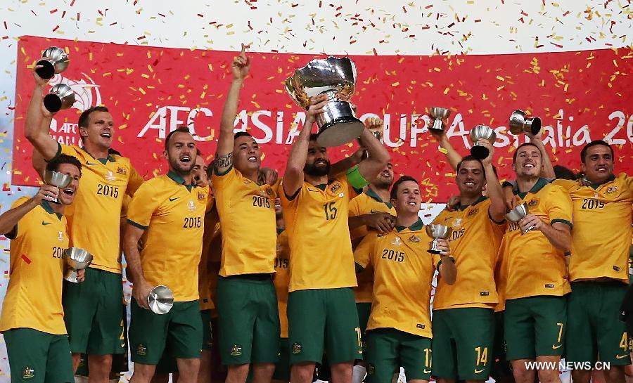 Australian players celebrate on the awards ceremony of the 2015 AFC Asian Cup in Sydney, Australia, Jan. 31, 2015. Australia won 2-1 in the final against South Korea and claimed the title of the event. (Xinhua/Cao Can)