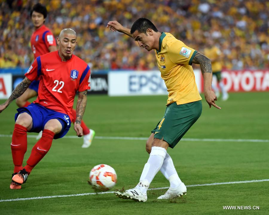 Australia's Tim Cahill (R) takes a shot on goal during the final match against South Korea at the 2015 AFC Asian Cup in Sydney, Australia, Jan. 31, 2015. (Xinhua/Guo Yong)