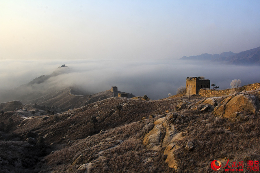 Located in north China’s Hebei province, the Tianqiao Great Wall was built in Ming Dynasty (1368-1644). In winter, the sea of clouds adds more charm to its magnificent landscape. (Photo source: people.cn)