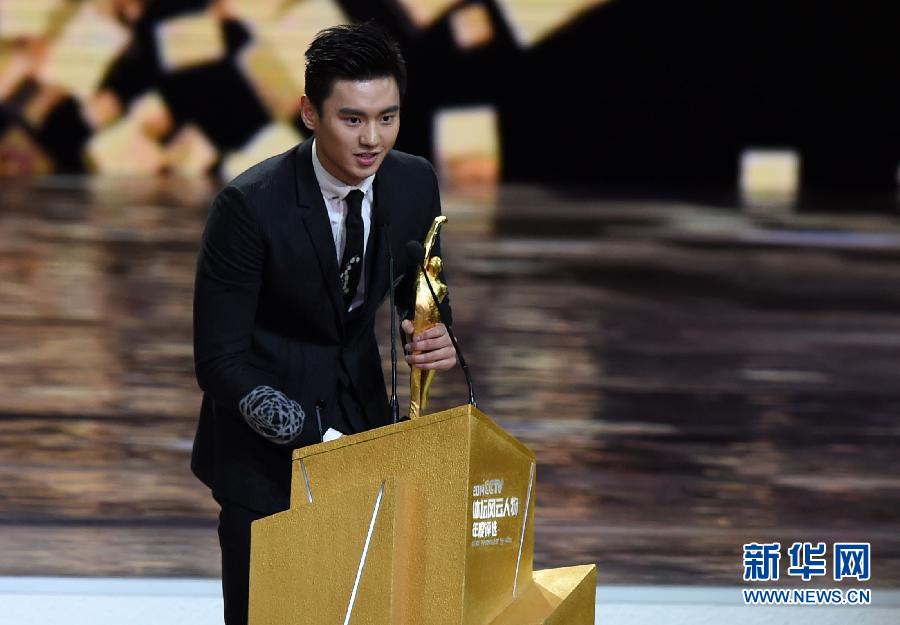 Swimming athlete Ning Zetao poses with trophy at the awarding ceremony of the 2014 Sports Personality of the Year after he was awarded the Best Male Athlete of the year, in Beijing, capital of China, on Feb. 1, 2015. (Source: Xinhuanet.com)