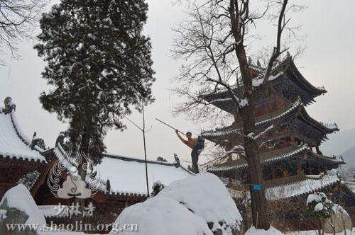 Shaolin Temple ushered in the first snow this year on Jan. 28, 2015. The snow ended early the next morning. Despite the bone-chilling cold, the monks in the temple practiced martial arts as usual in the snow. (Photo/shaolin.org.cn)
