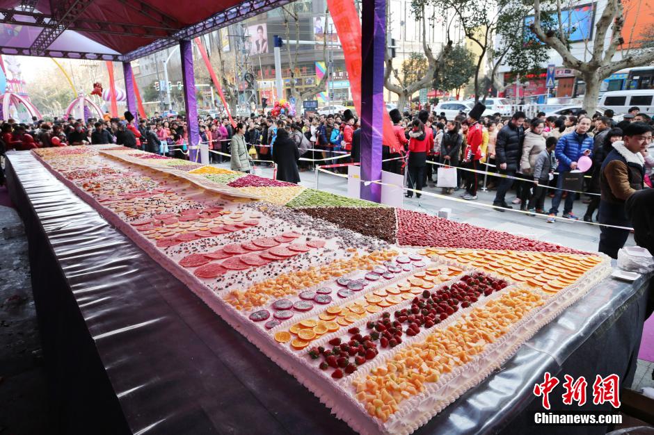 A 24-square-metre cake, made of fresh fruits including pineapple and strawberry is exhibited in Huaibei, east China's Anhui province on Jan. 18, 2015. Nine cooks spent more than eight hours to finish this cake. More than 5000 residents could taste this cake. (CNS/Wan Shanchao)
