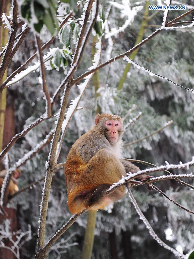 Photo taken on Feb. 3, 2015 shows a macaque on snow-covered tree branches at Wulingyuan National Park in Zhangjiajie City, central China's Hunan Province. (Xinhua/Zhang Mingtao)