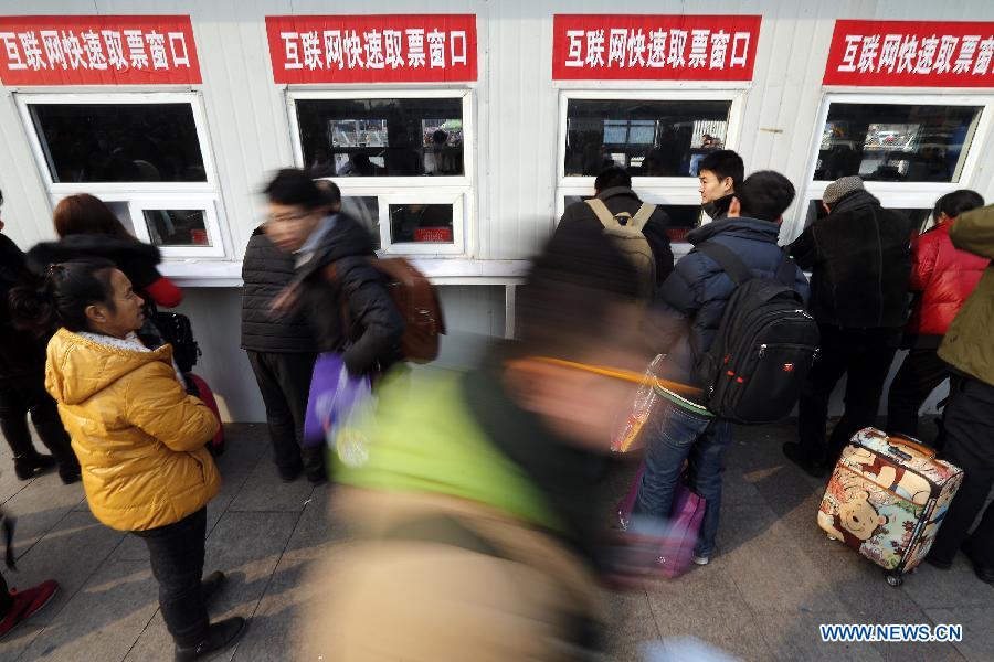 Passengers take tickets from windows for online sold tickets in Beijing Railway Station in Beijing, capital of China, Feb. 2, 2015. A 40-day spring festival travel rush will soon begin, during which the Beijing Railway Station is expected to send 4.2 million passengers and receive 4.3 million passengers. The station has taken out measures to better serve passengers on their way.(Xinhua/Shen Bohan)