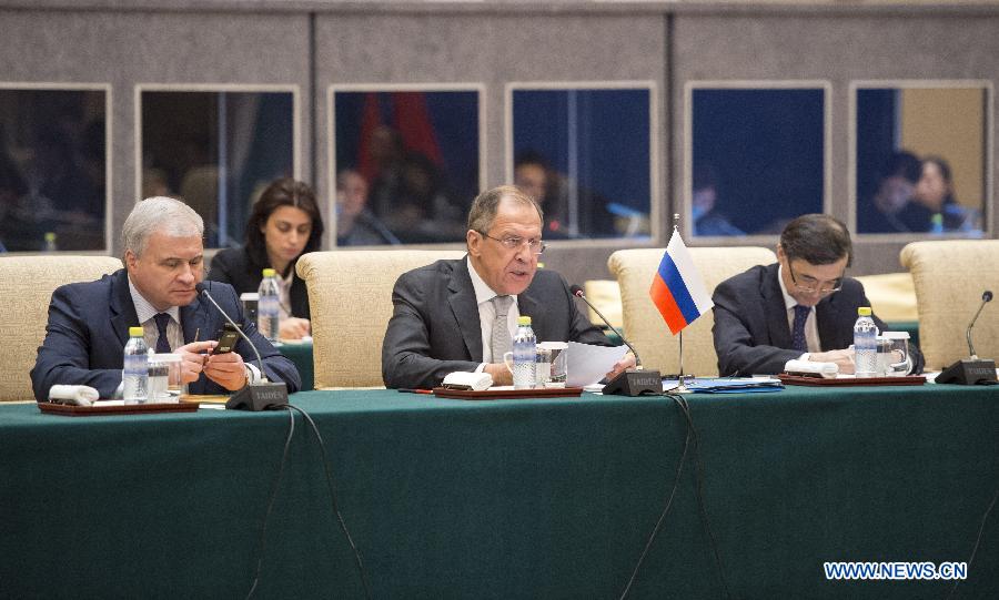Russian Foreign Minister Sergey Lavrov (C front) speaks during the 13th Meeting of Russian, Indian and Chinese (RIC) Foreign Ministers in Beijing, capital of China, Feb. 2, 2015. (Xinhua/Xie Huanchi)