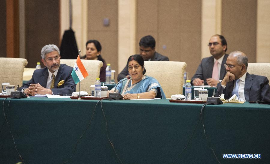 Indian Foreign Minister Sushma Swaraj (C front) speaks during the 13th Meeting of Russian, Indian and Chinese (RIC) Foreign Ministers in Beijing, capital of China, Feb. 2, 2015. (Xinhua/Xie Huanchi)