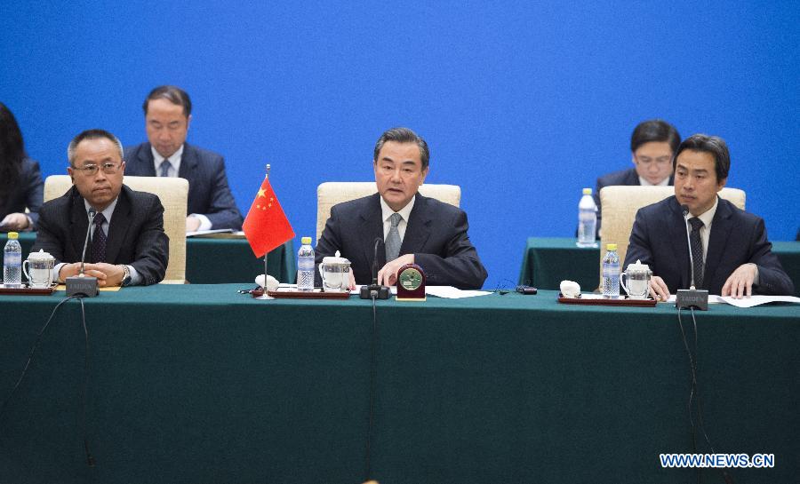 Chinese Foreign Minister Wang Yi (C front) speaks during the 13th Meeting of Russian, Indian and Chinese (RIC) Foreign Ministers in Beijing, capital of China, Feb. 2, 2015. (Xinhua/Xie Huanchi)