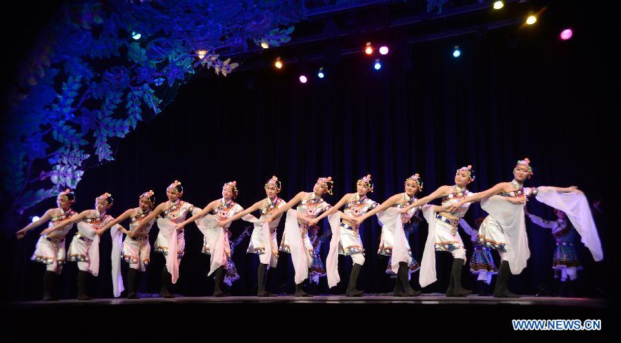 Chinese artists dance in a performance at the National Theater in Dhaka, Bangladesh, Feb. 3, 2015. A three-day Chinese cultural program started on Monday to mark the 40th anniversary of the establishment of the China-Bangladesh diplomatic relations. (Xinhua/Shariful Islam)