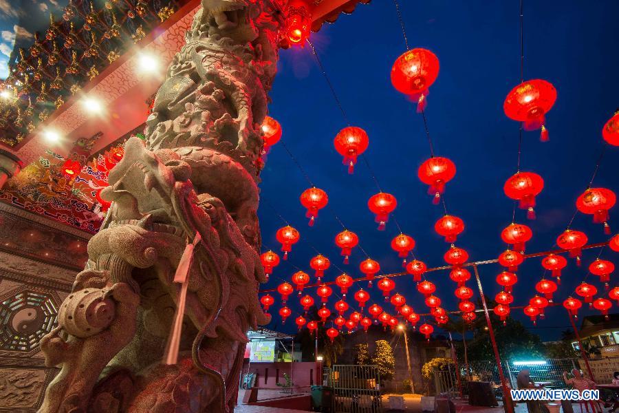 Red lanterns for the upcoming Chinese Spring festival are seen outside a temple in Cheras, State of Selangor, Malaysia, Feb. 3, 2015. (Xinhua/Chong Voon Chung)
