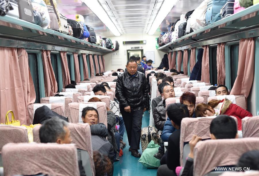 A man walks on train K5612 from Hangzhou, capital of east China's Zhejiang Province, to Fuyang of east China's Anhui Province, Feb. 4, 2015. The 40-day travel frenzy known as "chunyun", the hectic period through the Chinese lunar New Year, or the Spring Festival, which falls on Feb. 19 this year, began on Feb. 4 and will last until March 16. Train 5612 is the first chunyun train from Hangzhou. (Xinhua/Han Chuanhao)