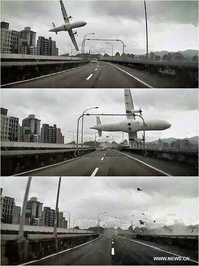 Combined photos taken by an automobile data recorder shows an airplane crashes over a bridge in Taipei, southeast China's Taiwan, Feb. 4, 2015. A plane of the Taiwan TransAsia Airways came down into a Taipei river Wednesday, with more than 50 people on board, confirmed the civil aviation authorities of Taiwan. Contact with the ATR-72 Flight, scheduled from Taipei to Kinmen, lost at about 11 a.m. Then the plane was found in the river by the Nanhu Bridge. (Xinhua)