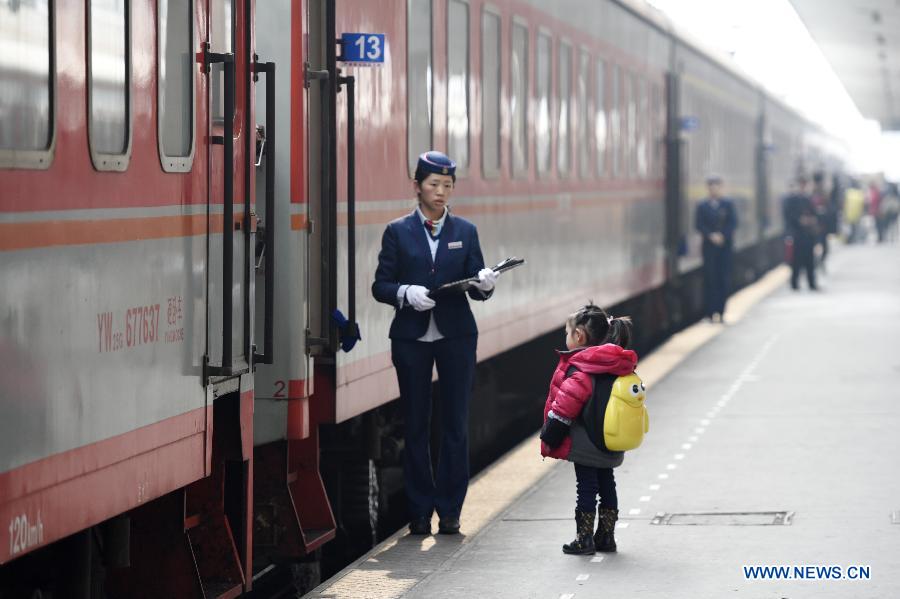 A little girl waits for her mother, who has boarded to place their luggage, to pick her up outside a train to Guiyang, capital of southwest China's Guizhou Province, at the railway station of Hangzhou, capital of east China's Zhejiang Province, Feb. 4, 2015. The 40-day travel frenzy known as "Chunyun", the hectic period surrounding Chinese New Year, or Spring Festival, which falls this year on Feb. 19, began on Wednesday and will last until March 16. (Xinhua/Ju Huanzong)