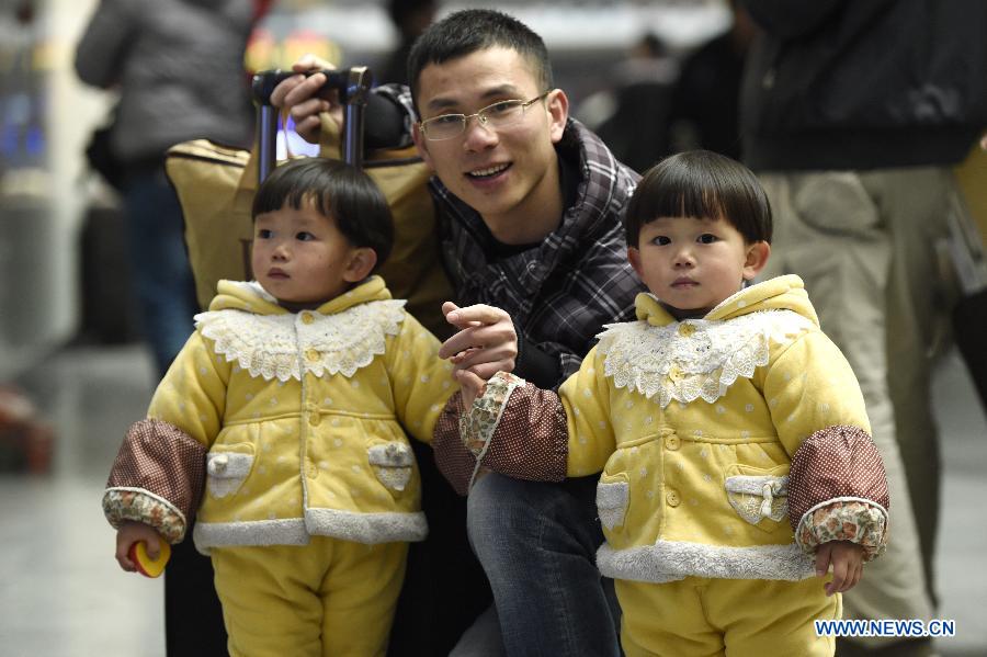 Two-year-old twin sisters Tiantian (R) and Mimi (L), together with their father Huang Haibo, wait for a train to their mother's hometown in southwest China's Guizhou Province at the railway station of Hangzhou, capital of east China's Zhejiang Province, Feb. 4, 2015. The 40-day travel frenzy known as "Chunyun", the hectic period surrounding Chinese New Year, or Spring Festival, which falls this year on Feb. 19, began on Wednesday and will last until March 16. (Xinhua/Ju Huanzong)