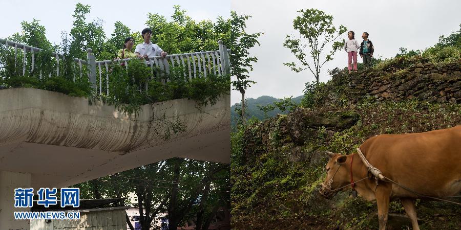 Left-behind children stand in field while their parents on an overpass in a big city.(Xinhua/Liu Jie)