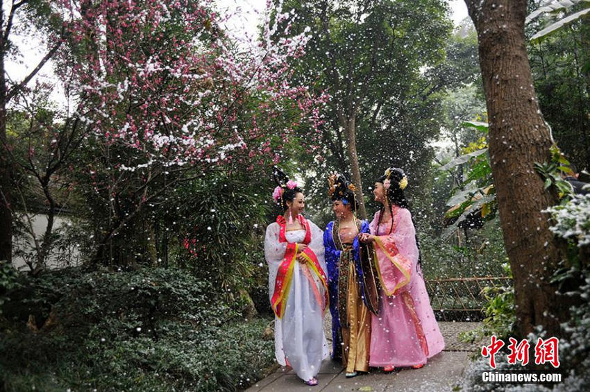 Three girls in ancient costumes enjoy themselves amidst the plum blossoms at Du Fu's Thatched Cottage in Chengdu, southwest China's Sichuan province. The blooming flowers have attracted many tourists to come and enjoy the natural beauty. (CNS/An Yuan)